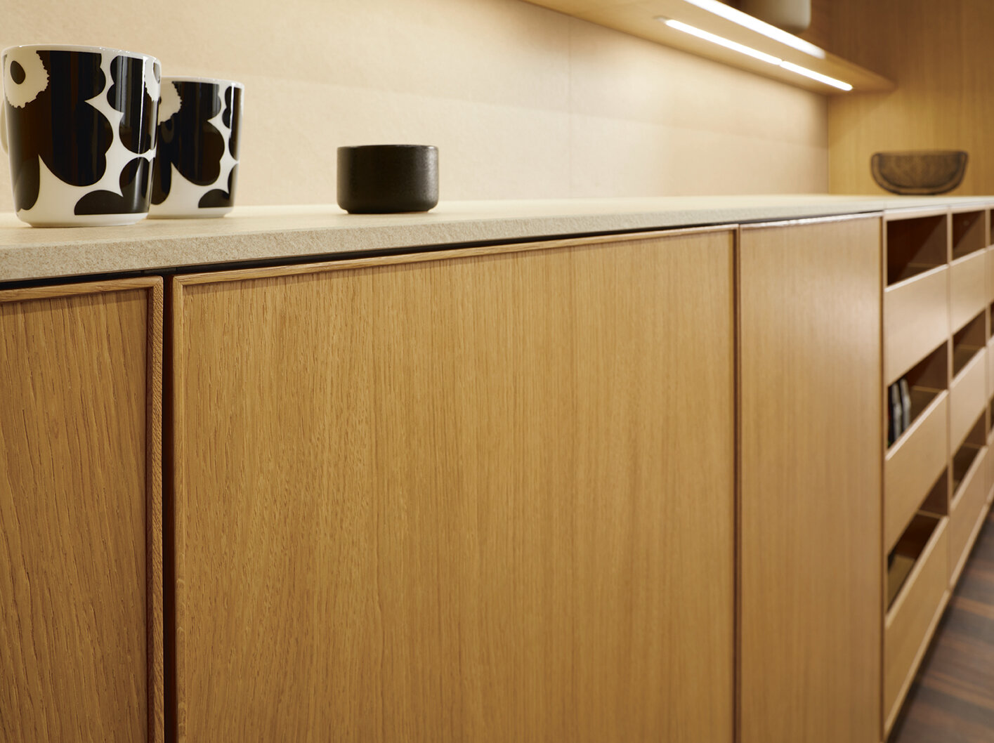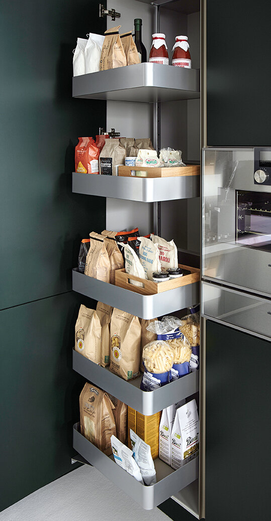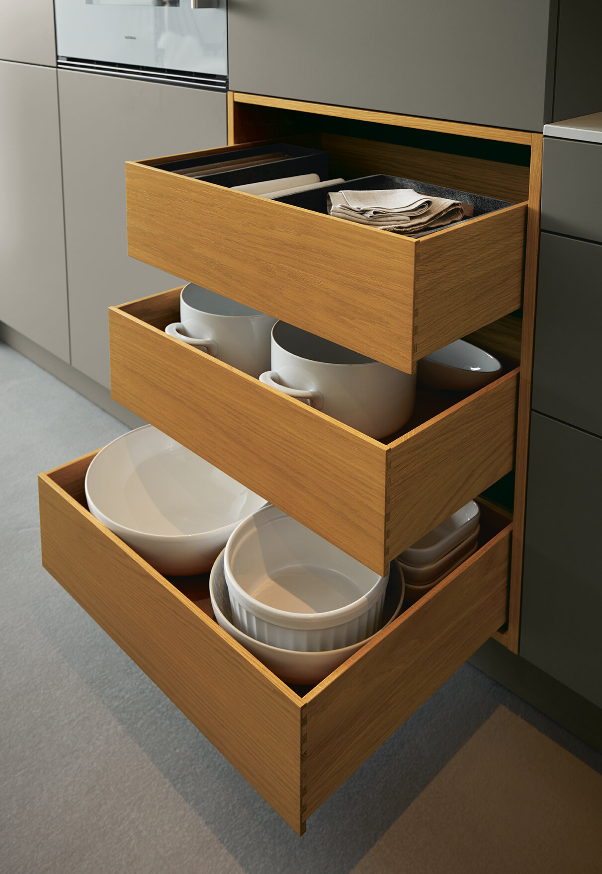 Maken een eenvoudige bediening van alle laden en uittrekelementen mogelijk zonder het strakke keukendesign te storen.