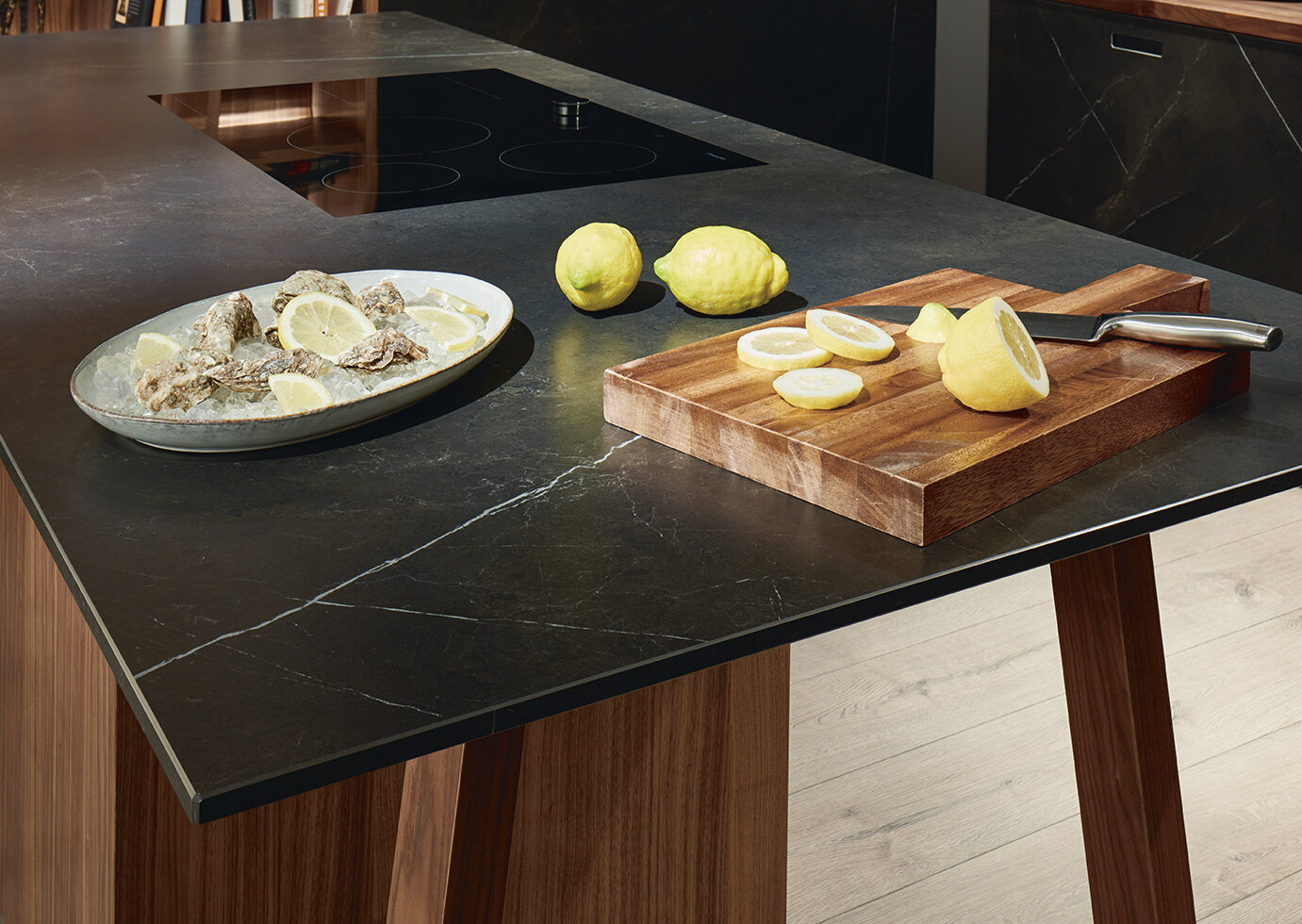 het vrijstaande statement in de keuken. Zijn schuin geplaatste poten maken van de kooktafel een puristische blikvanger.